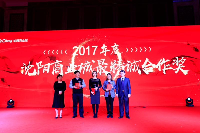 活动现场,陈哲元董事长、钟静总经理代表沈阳爱游戏ayx官方网页向萃华金店、周大福品牌、辽宁和慧仓商贸、影儿会所颁发了2017年度最精诚合作奖。